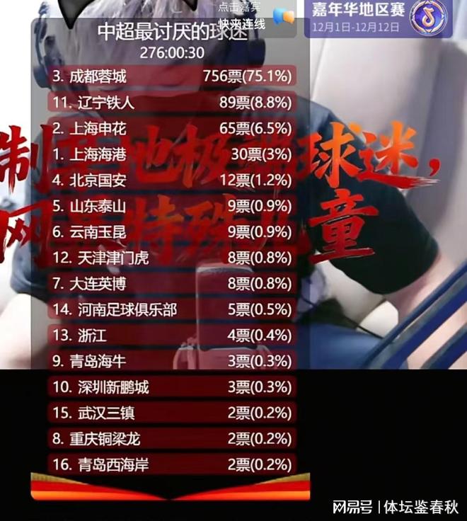 令大家感到意外的是,排在这份榜单第一位的,不是大家印象中上海申花和北京国安这些争议大的老牌球队球迷,而是成都蓉城球迷,而且票数优势非常明显,比第二名的辽宁铁人球迷足足多出近700票。很多人第一反应都是意外,有人甚至在直播间里反复确认是不是点错了选项。毕竟从成绩到关注度,成都蓉城这些年更多是被讨论“踢得好不好”“氛围热不热”,很少在这种榜单上占据头名。
