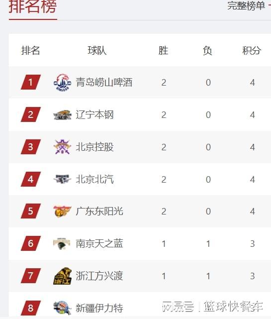 目前,由于CBA常规赛才刚开始不久,各支球队在积分榜上的排名变化非常大。这一轮比赛过后,还剩下6支球队保持不败金身,分别是青岛、辽宁、北控、北京、广东以及广州。这其中前5队战绩都是2胜0负,广州队少赛一场,战绩是1胜0负。除了这6支球队外,其余14支球队都已经输球了。目前,CBA积分榜榜首位置的变化也非常频繁,上一轮北京挤掉广厦登顶,现如今,青岛又挤掉北京,冲上积分榜第一位的位置。排在积分榜第2的是辽宁队,最近两场比赛,辽宁队的状态非常不错,先后击败了天津队和广厦队,这其中击败广厦队可以说是爆了不小的冷门。由于广东、北控等队也赢球的缘故,辽宁队的排名又上升一位,从积分榜第3名上升到第2。北控队这一战拿下天津队以后,他们的战绩也变成了2胜0负,一波两连胜后,他们的排名杀进积分榜第三的位置,而北京队则从积分榜第1,下滑到第4名。11冠王广东队,这一轮比赛挑战浙江队,尽管是客场作战,广东队还是顶住压力,凭借着下半场的爆发,广东队最终以101-98险胜浙江队,成功拿到两连胜。在这一场比赛过后,广东队的排名又上升了。目前,他们在积分榜的排名已经上升到第5,杀进四强指日可待了。而排在积分榜第6的是同曦队,这一轮比赛,同曦队在郭昊文的带领下,他们竟然爆冷掀翻上海队,成功拿下赛季首胜。排在积分榜第7的广厦。卫冕冠军输给辽宁队以后,战绩变成1胜1负,在过去短短两天,广厦在积分榜的排名从榜首,下滑到积分榜第四,现如今,他们又被挤到积分榜第7。如果下一轮比赛,广厦无法赢球的话,他们的排名将直接跌出前八。排在第8名的是新疆队。上一轮下滑到积分榜第14的山西队,这一轮比赛击败了宁波队,拿下赛季首胜。他们的排名又一次杀回到积分榜第9。宁波队则位居第10位。福建第11,深圳第12名。上海队这一战爆冷输球后,他们的排名直接跌出前12名,目前,上海队以1胜1负的战绩,排在积分榜第13名。广州队的战绩是1胜0负,排在积分榜第14位。第15-17名分别是江苏、天津以及四川,他们的战绩都是0胜2负。而第18名则是浙江队,新赛季开赛以来,他们接连输球,遭遇两连败后,球队的排名直线下滑。积分榜第19名则是吉林队,而山东队则垫底,排在积分榜第20名。附:CBA积分榜最新排名更新1-5:青岛、辽宁、北控、北京、广东6-10:同曦、广厦、新疆、山西、宁波11-15:福建、深圳、上海、广州、江苏16-20:天津、四川、浙江、吉林、山东以上内容请关注首页JRS